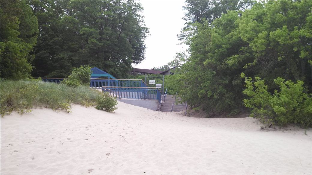 To launch a kayak there is 75 feet of concrete path from the parking lot to 12 steps and 75 feet of slightly sloped sandy beach to Lake Michigan.