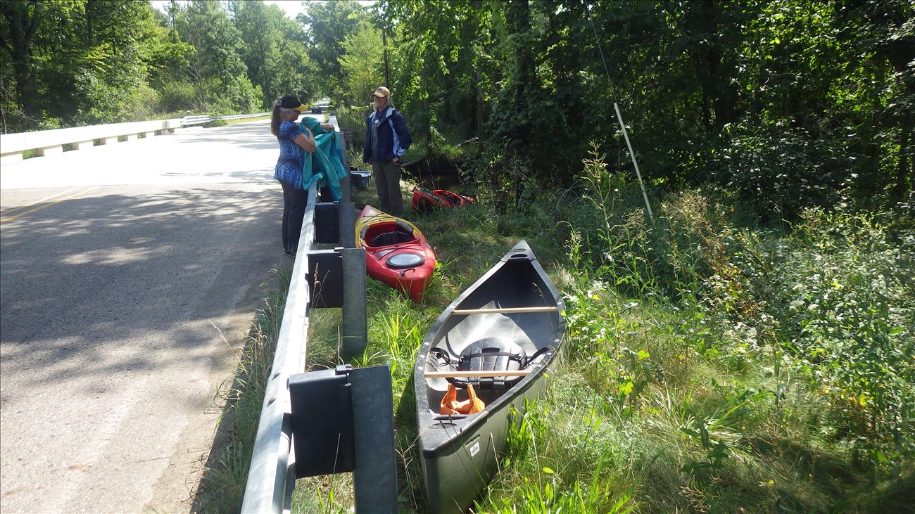 Unless you temporarily park on the bridge to unload, it is a long carry from the end of the guardrails where it is possible to park on the shoulder. From the southwest bridge abutment, it is a short but steep climb down over vegetation to the water which gets deep rapidly.