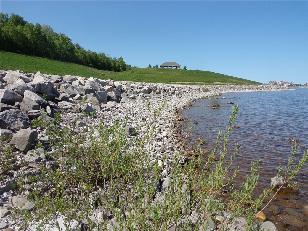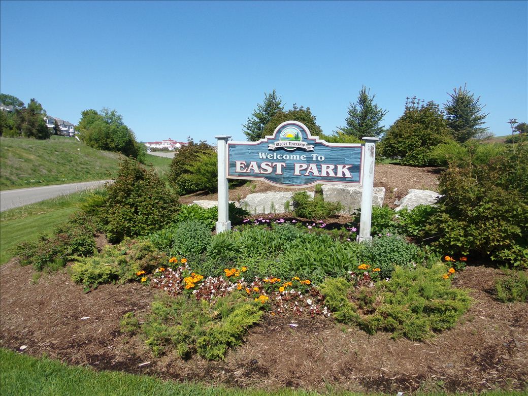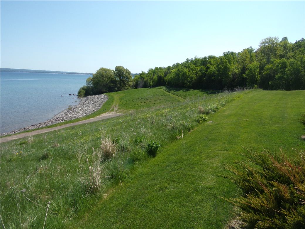 Panoramic views of Little Traverse Bay and of Bay Harbor. Water access is separated from the park amenities by a steep hill. Shoreline is developed and has large rocks.