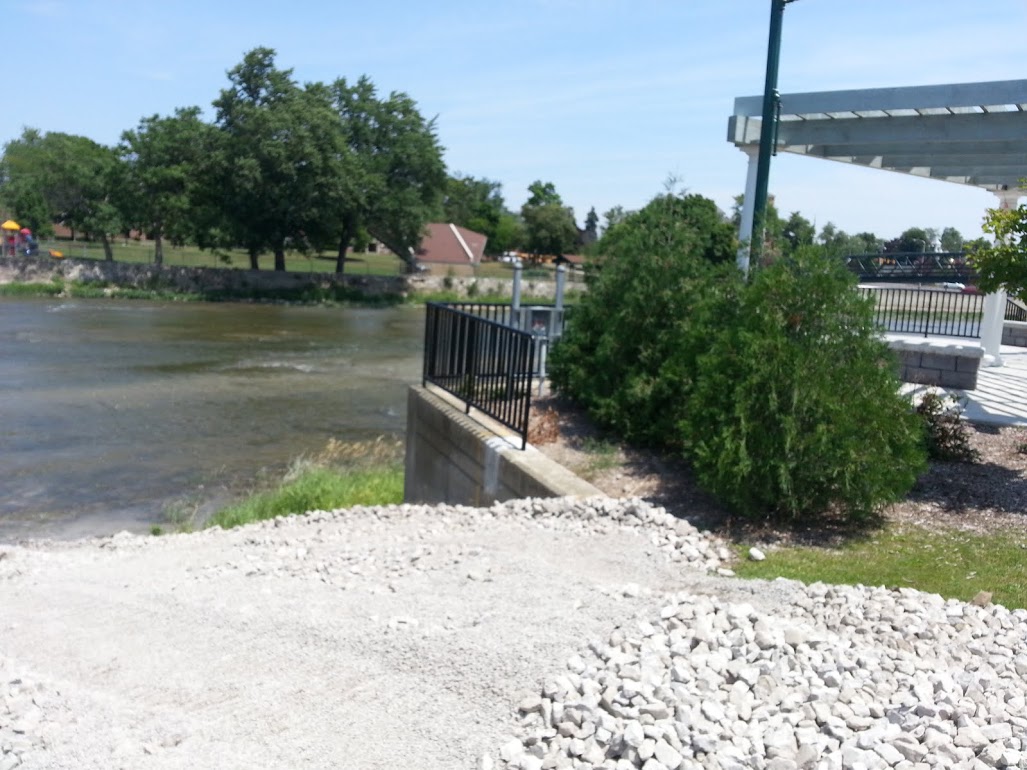 Access the river at the far western end of the city parking lot on the south bank of the river, just west of the fishing platform. Lot is connected by a pedestrian bridge to St. Mary's Park, which has restrooms, water, and picnic and play areas. Site is near downtown restaurants, shops and pathways.
