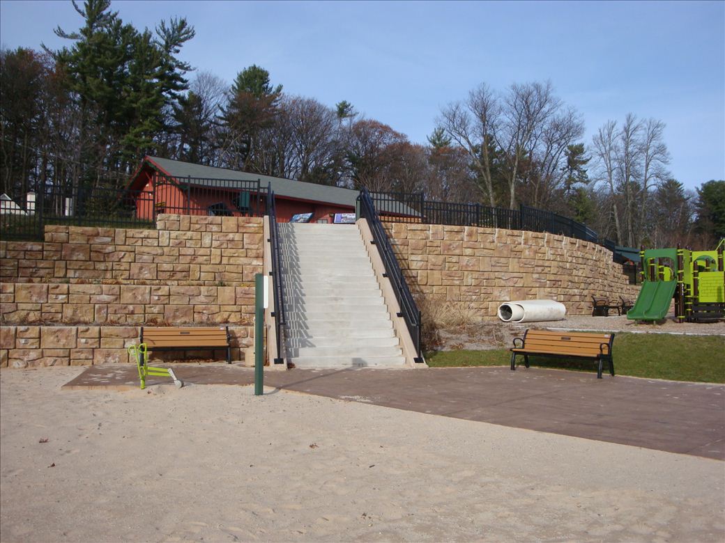 A handicap ramp down to the water provides carry in access down the slope to the sandy beach with a sandy bottom. A developed launch. with limited parking, is at Woodruff Street just 1/2 mile north.