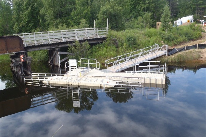 Includes a universal accessible kayak launch and fishing pier, railroad depot pavilion, log cabin interpretive center, picnic tables, restrooms, and trail head for multi-uses such as biking, snowmobiling and ATV use.