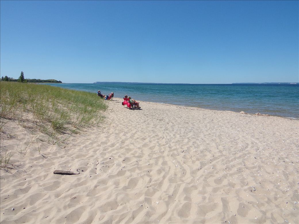 Sandy beach access connected to parking and bathrooms by a boardwalk.