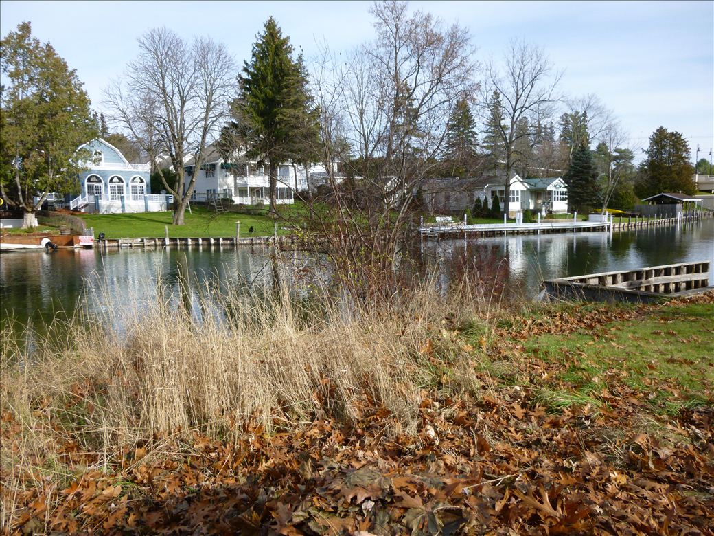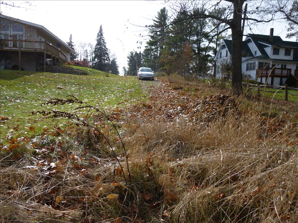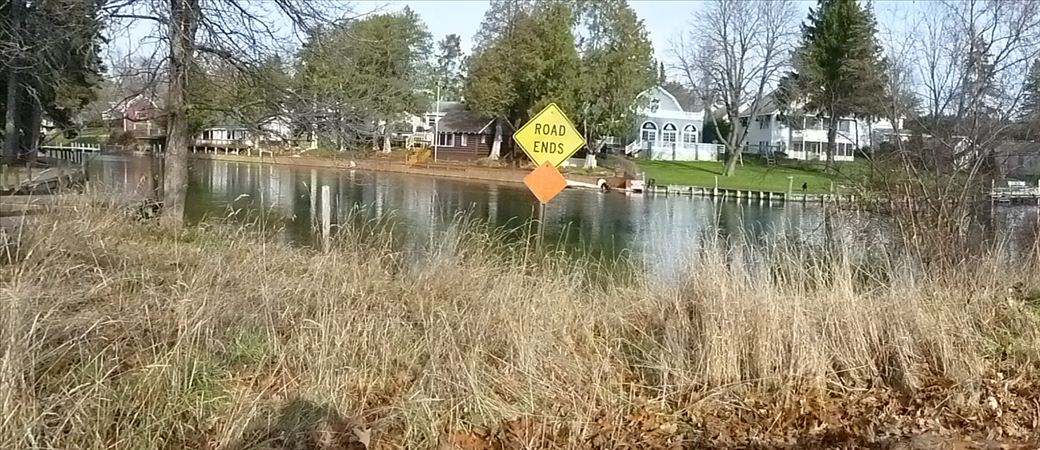 Undeveloped area at end of gravel road. Residential on both sides. Overgrowth at edge of river.