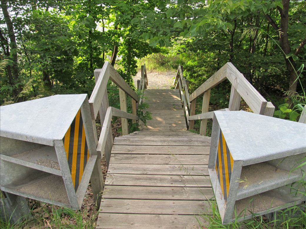 Small community park along M-37 with water access, parking lot, and restroom. Water access is down steep set of wood stairs across M-37 from parking lot area. Hand pump is available for drinking water.