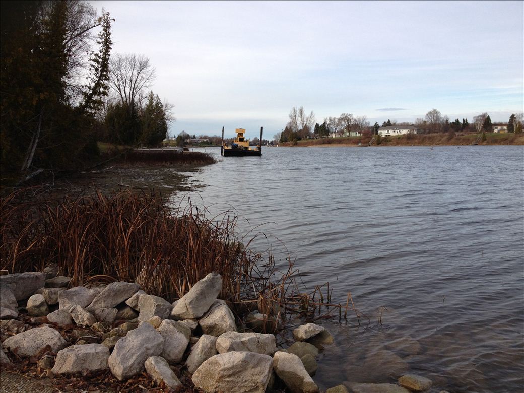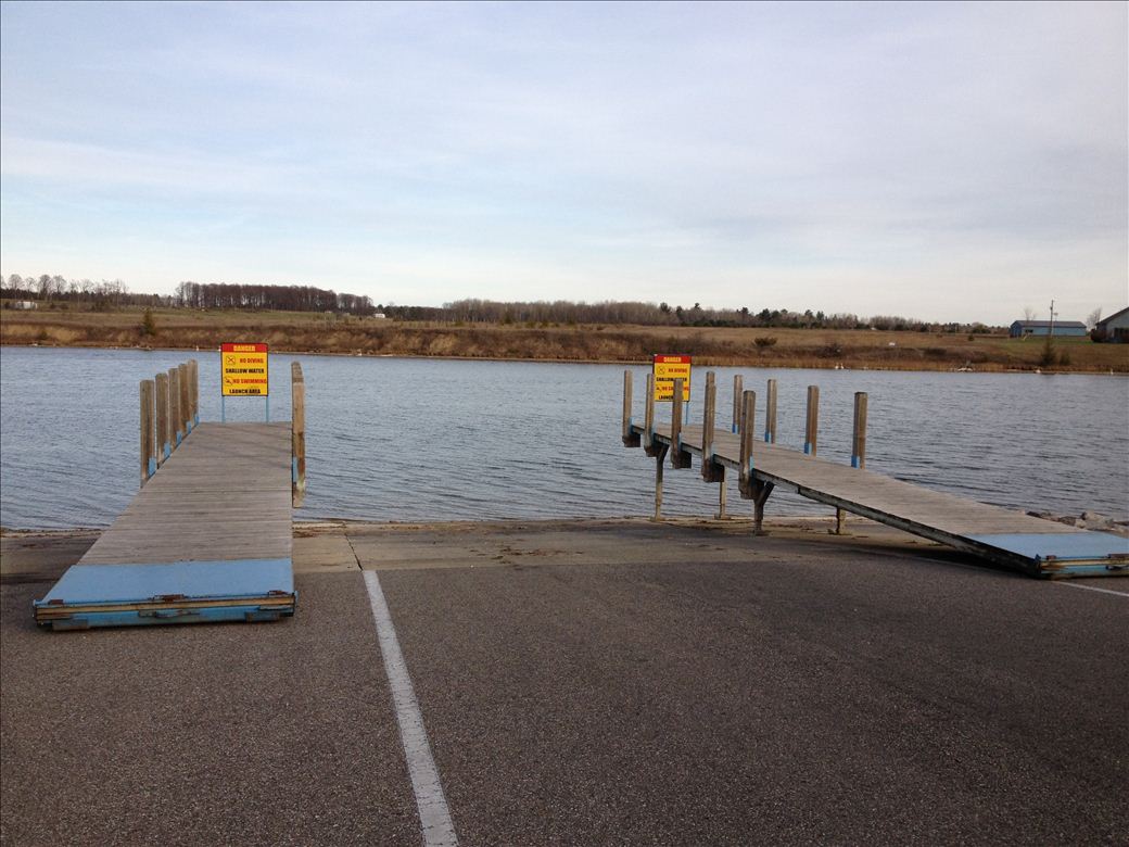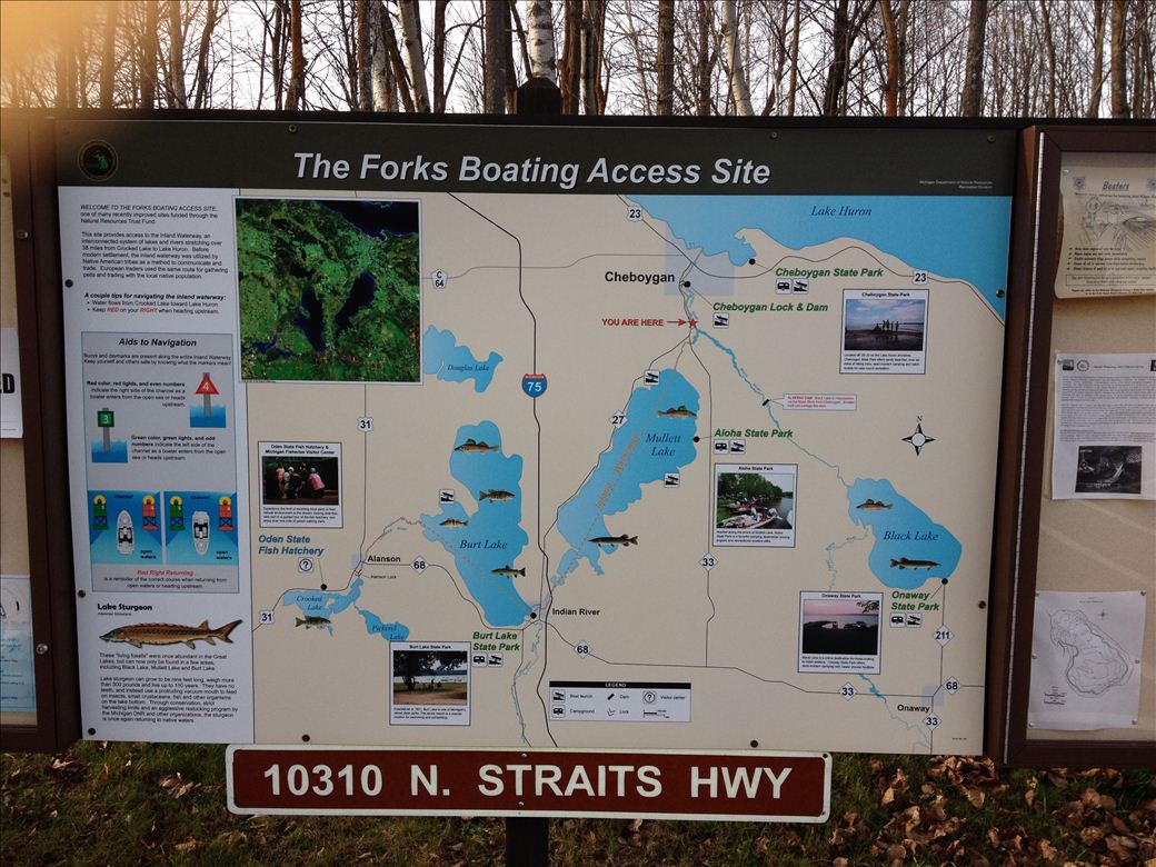 A developed boat launch on the Cheboygan River. Huge parking area, inland waterway signs, pit toilet run by the DNR; DNR recreation passport is required.