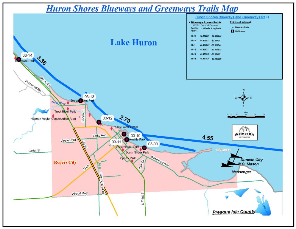 Comments: This section offers a unique opportunity for a paddle and bike trip. The Sunrise Pathway runs through Rogers City to Hoeft State Park and offers some of the best Lake Huron coastline biking in Michigan.